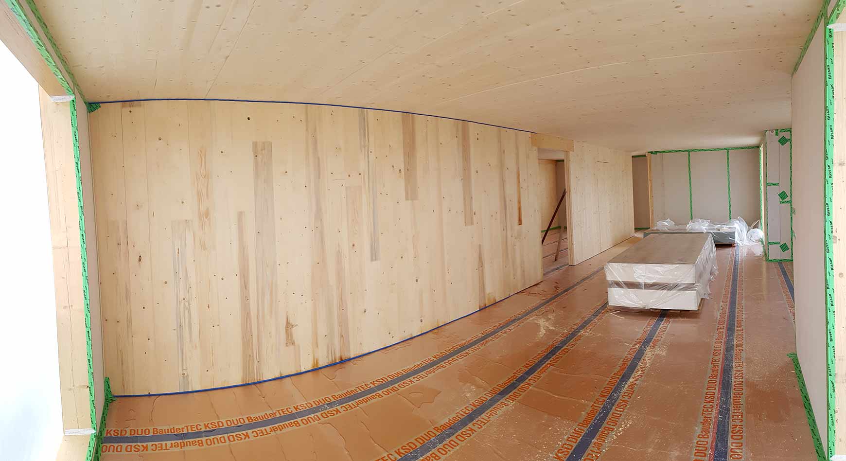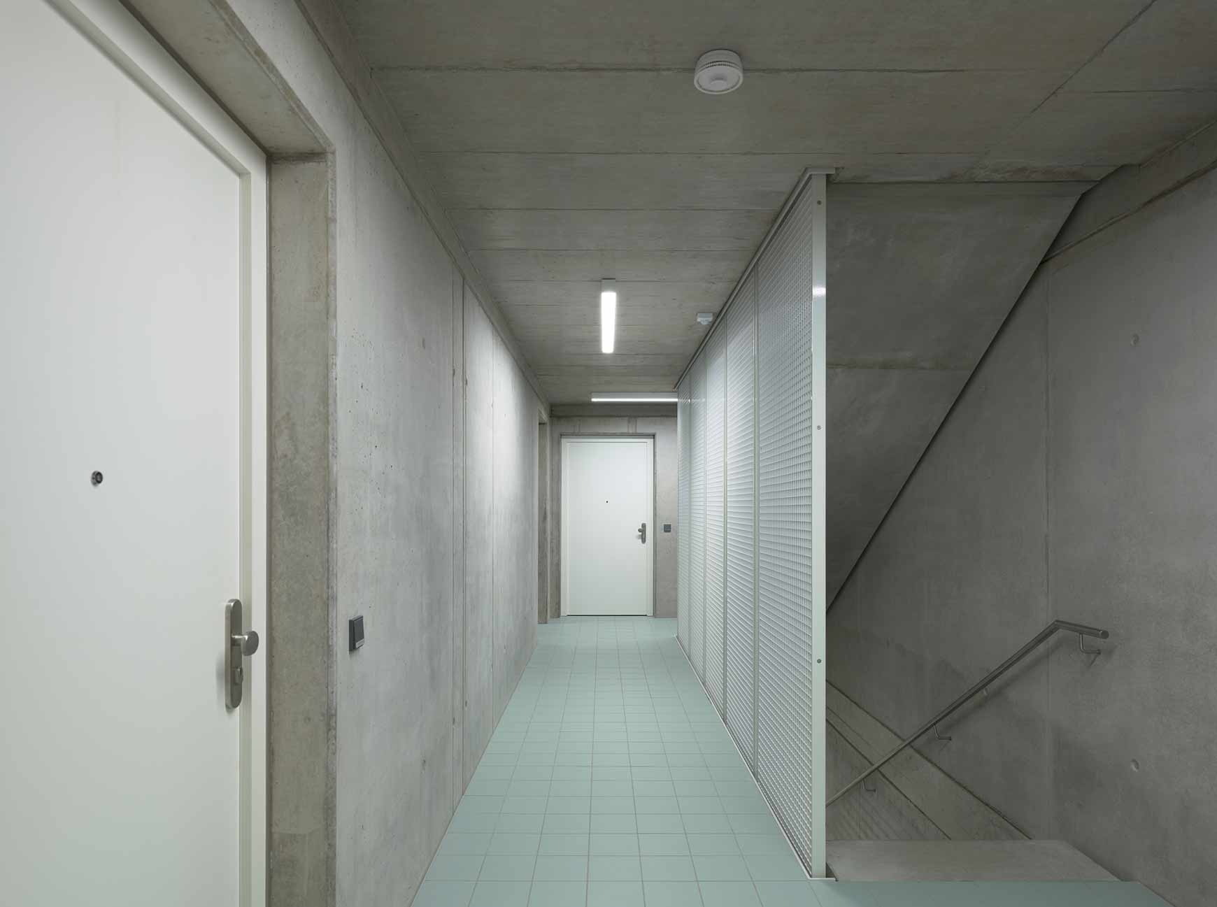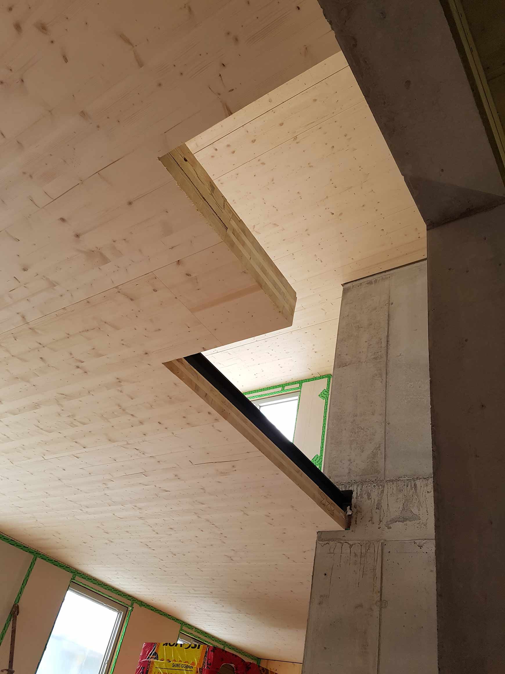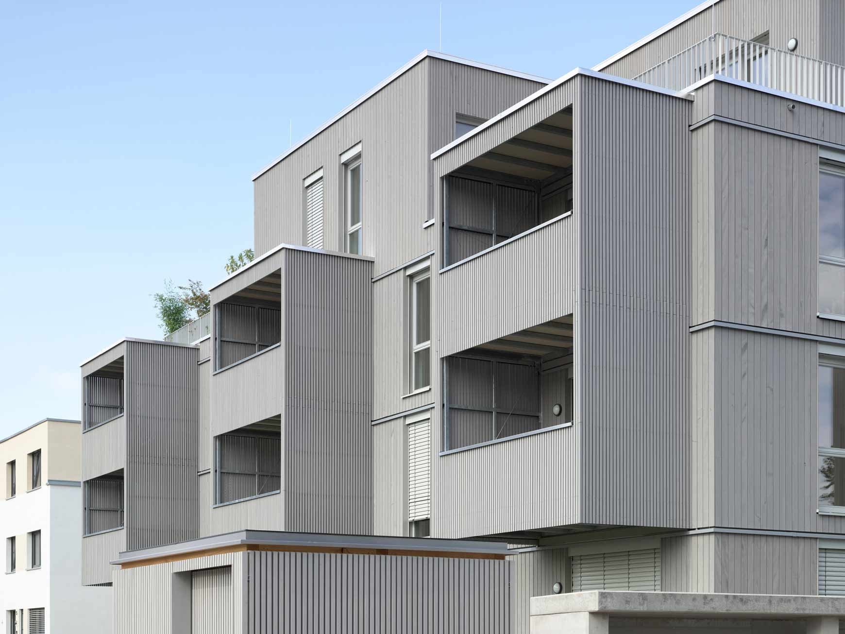 | Tragwerk: | 4-geschossiges Mehrfamilienhaus in Holzbauweise, Decken aus Brettsperrholz, Wände aus Brettsperrholz und Ständerwände, massiver Aussteifungskern aus Sichtbeton, Tiefgarage mit Flachdecken |