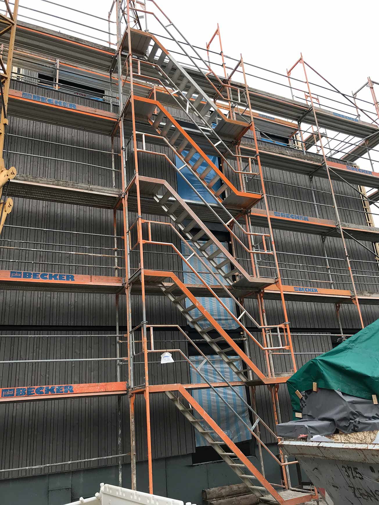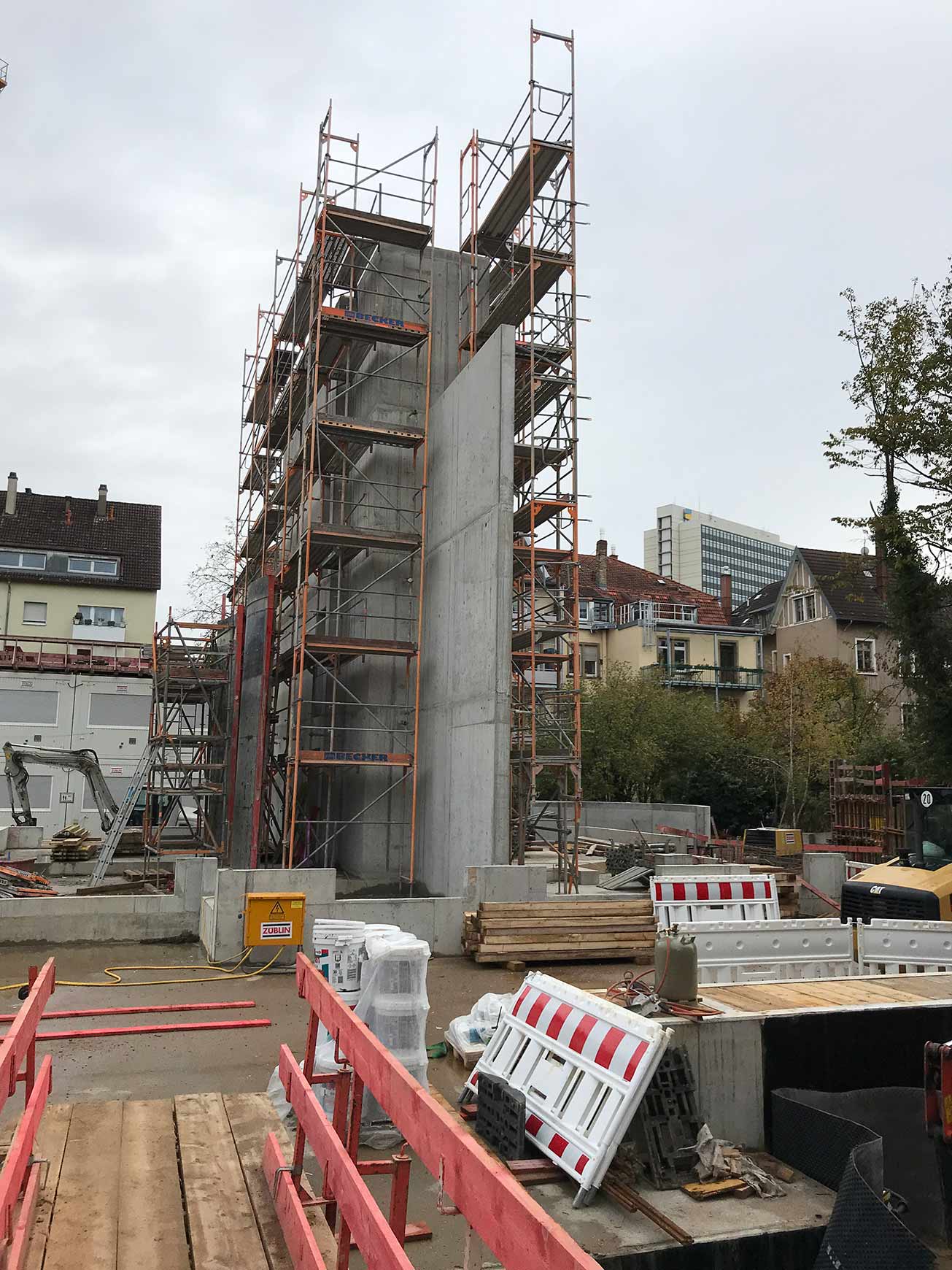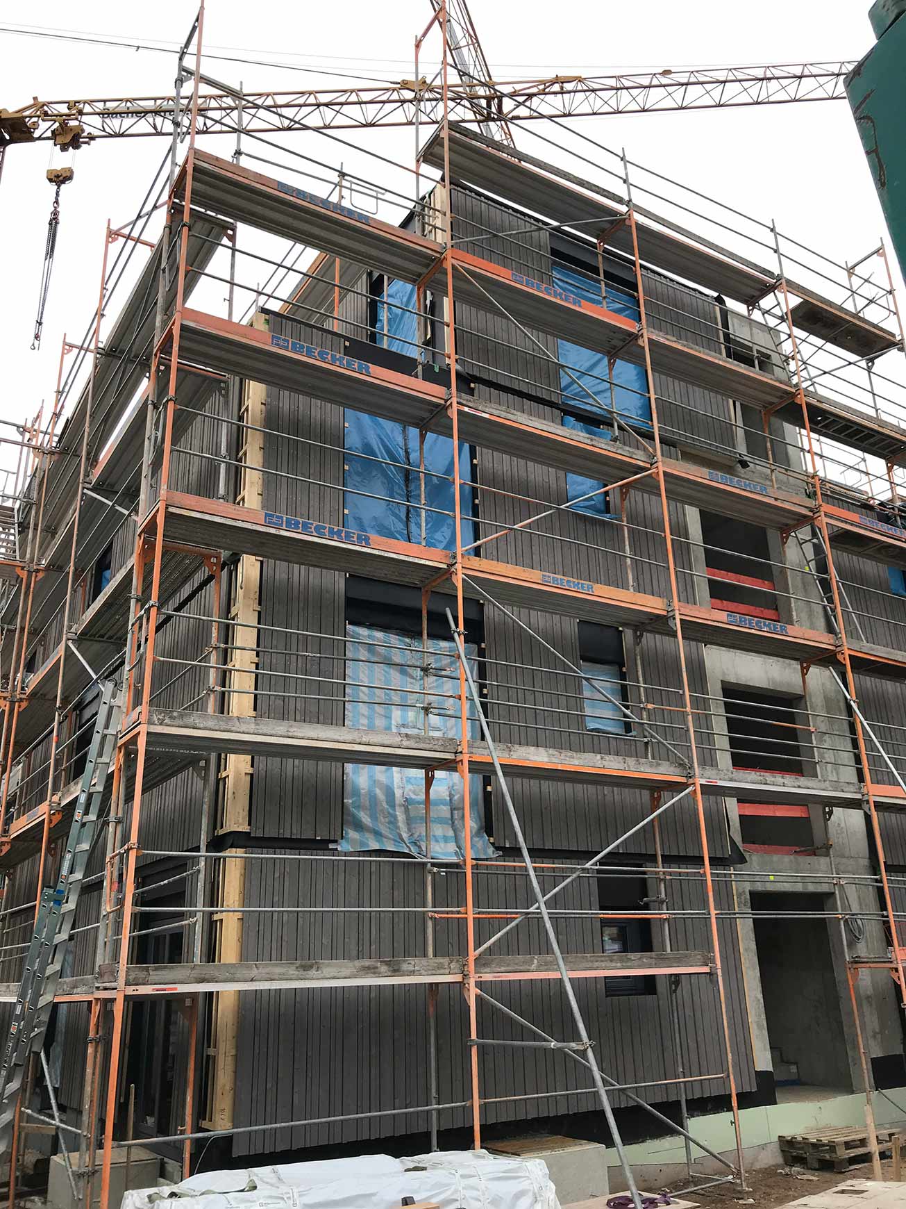 | Tragwerk: | 4-geschossig in Holzbauweise, Decken aus Brettsperrholz, Wände aus Brettsperrholz oder Ständerwände, Aussteifungskern aus Stahlbeton, TG mit Flachdecken |